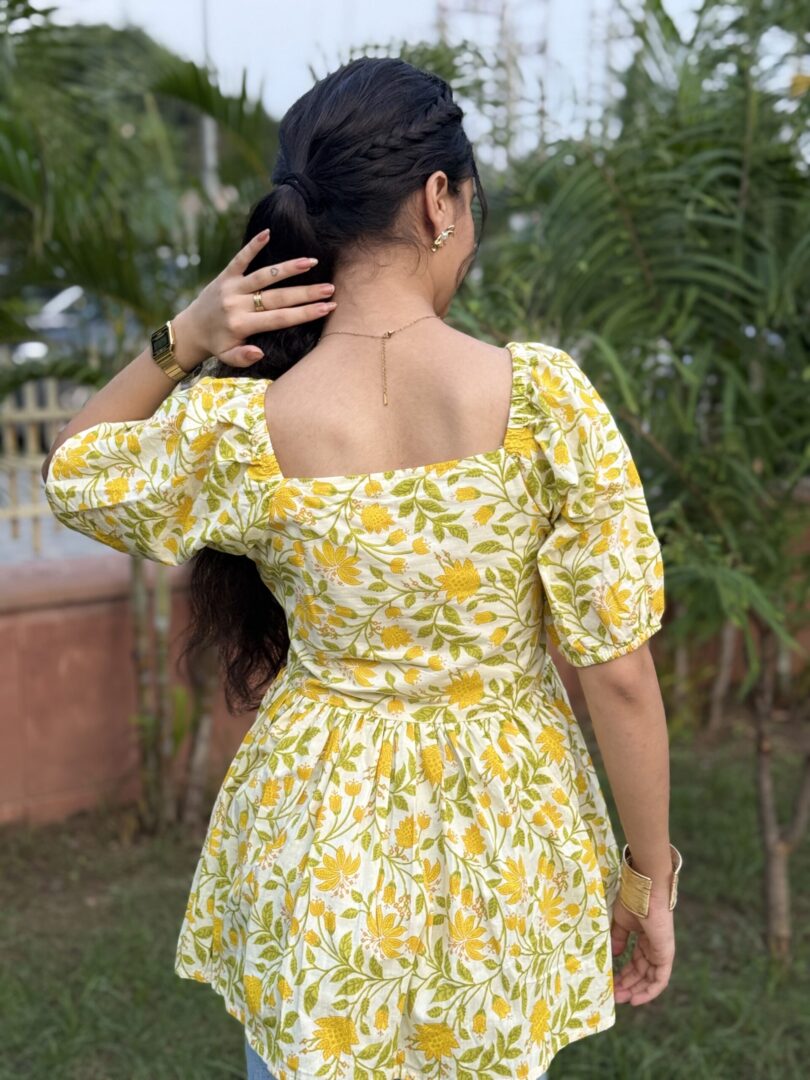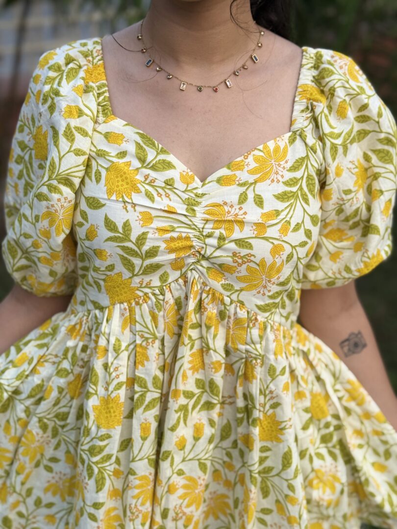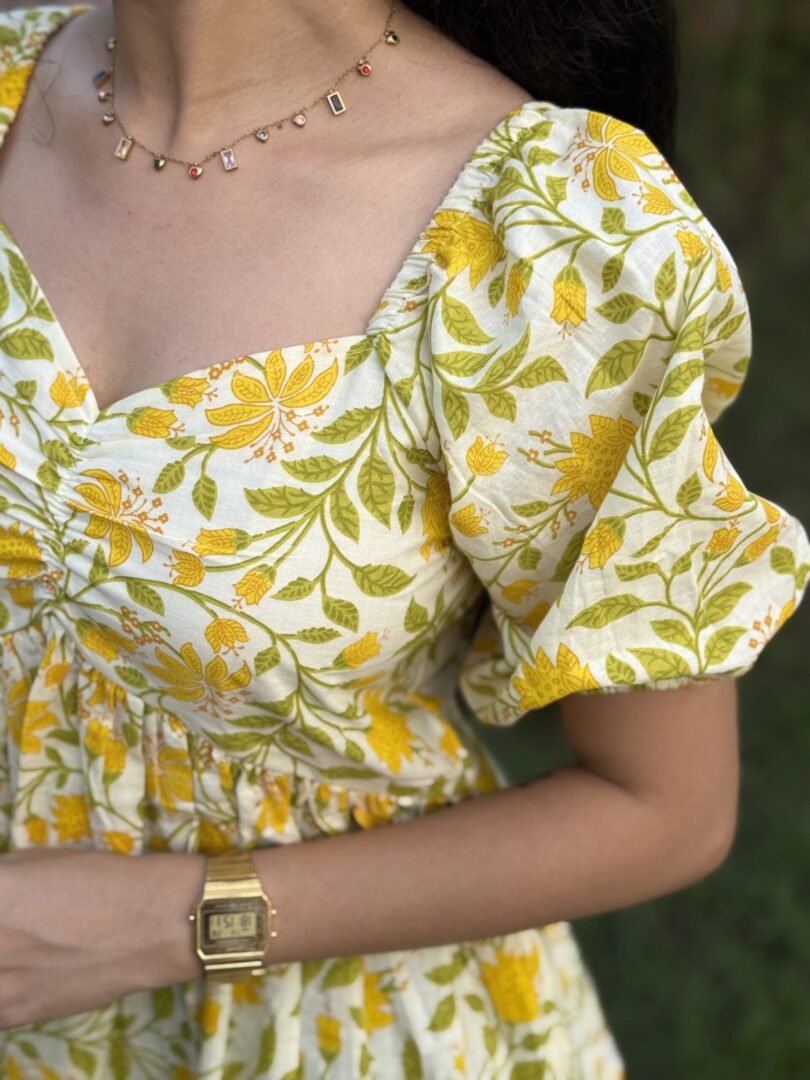 The bright yellow and green floral block-inspired print on a soft cream base adds a refreshing summer vibe. The puffed elbow sleeves balance elegance with playfulness, while the flowy flare makes it perfect for twirling moments.