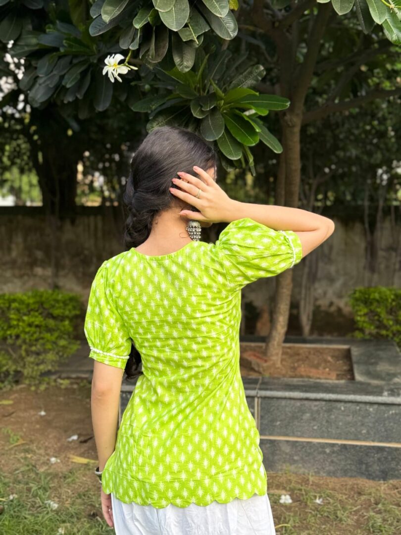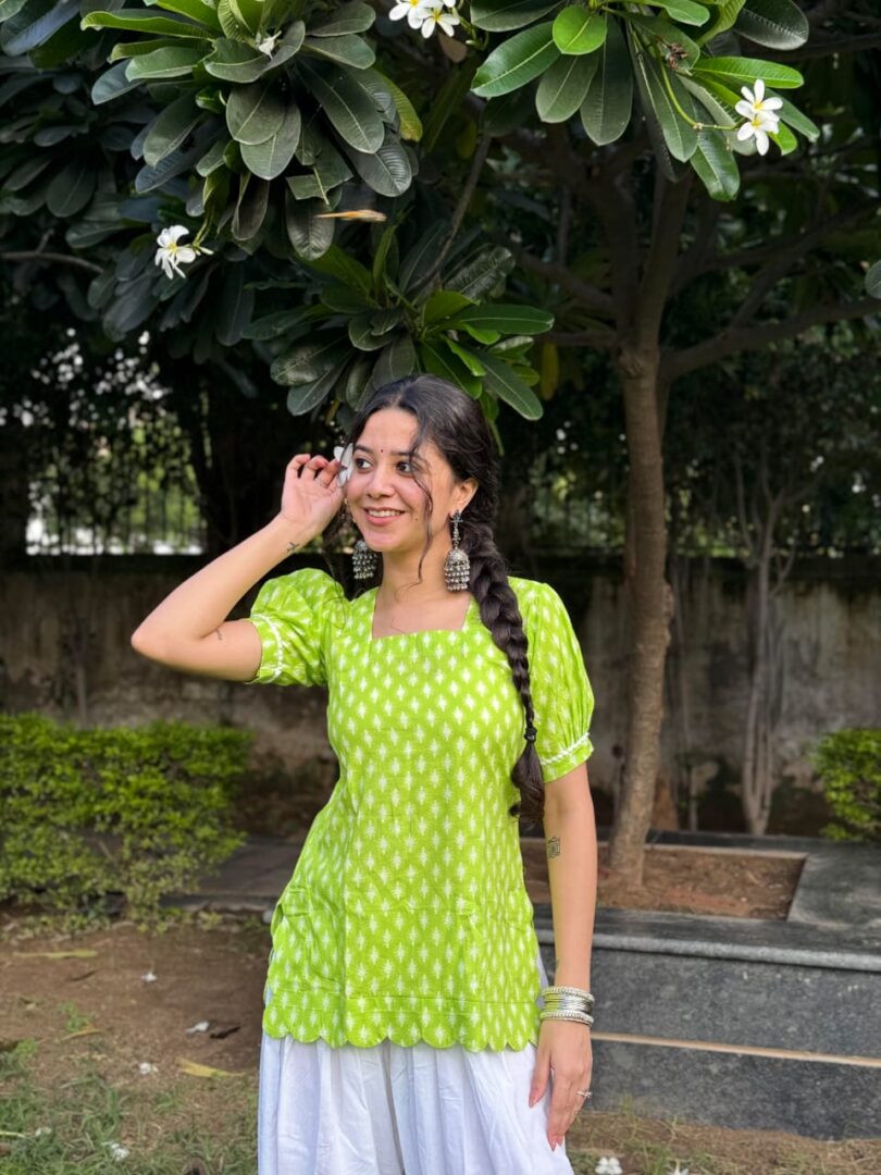 Step into freshness and charm with this lime green printed kurti that perfectly blends tradition with a trendy twist.