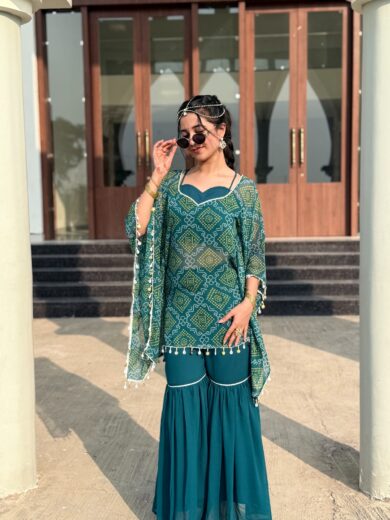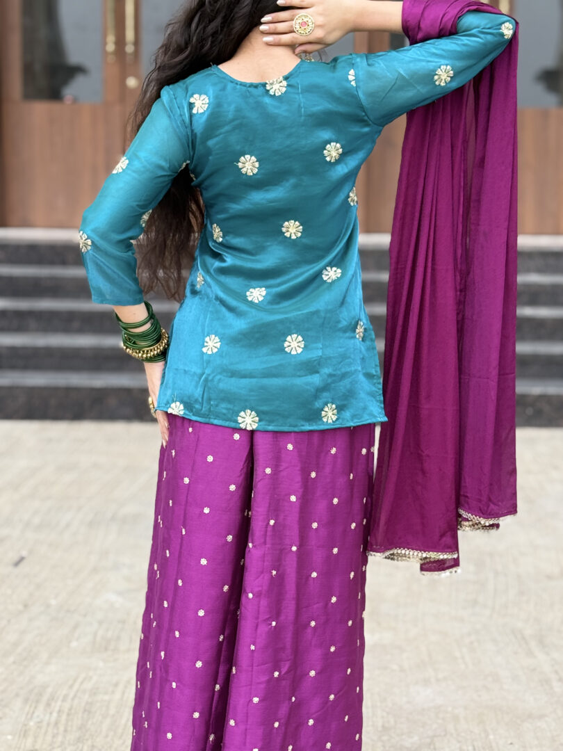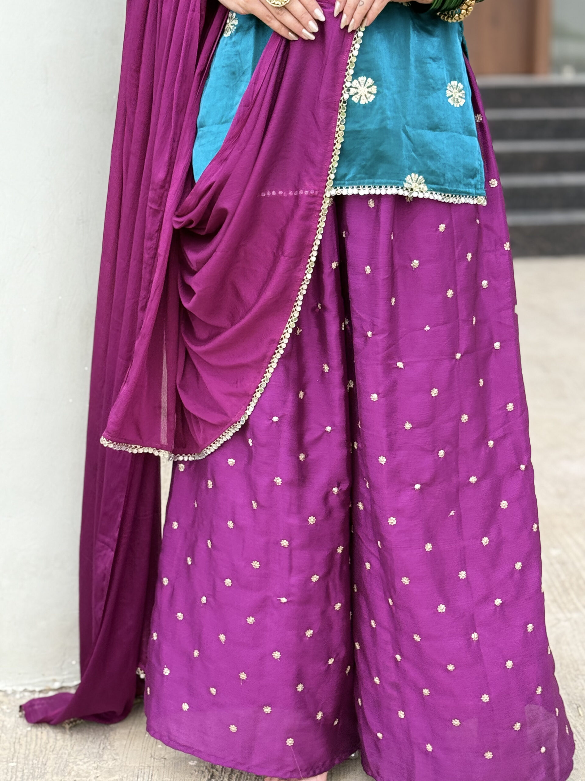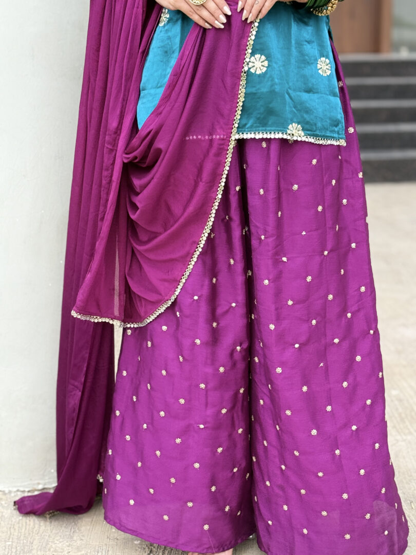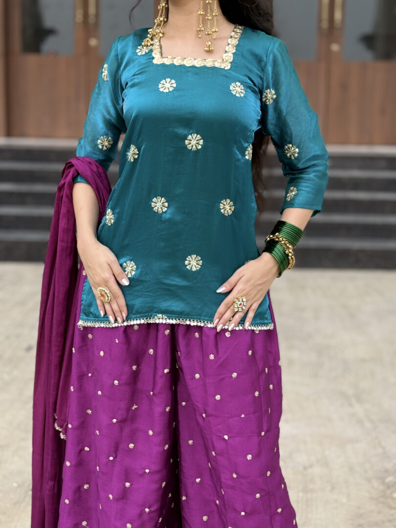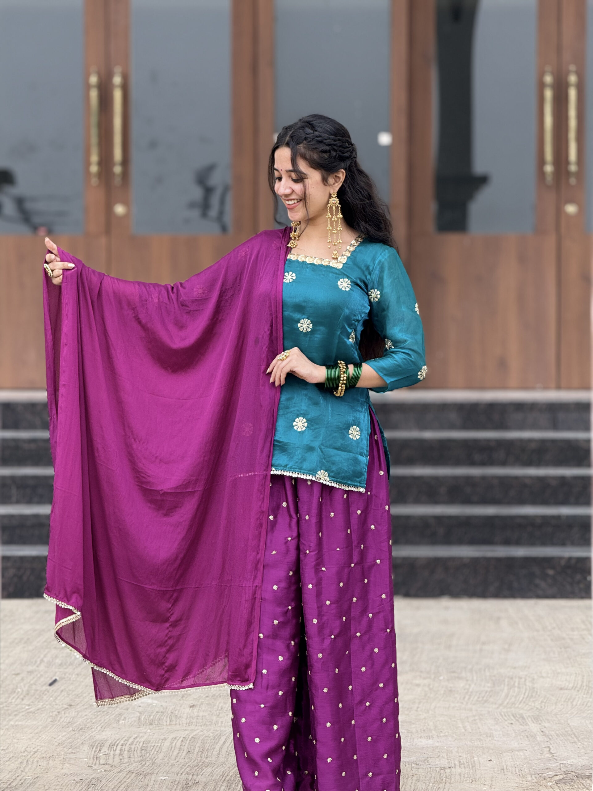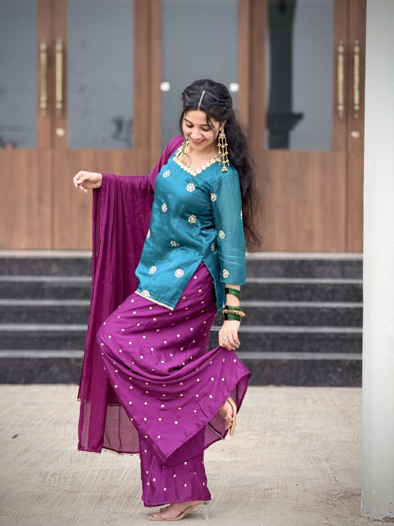 Step into timeless elegance with Nazakat — a royal ensemble that blooms with grace and charm. The rich teal silk kurti, adorned with delicate gota embroidery, pairs beautifully with the Purple Loose Palazzo and dupatta, creating a contrast that speaks of regality and heritage. The subtle mirror-like detailing adds just the right touch of shimmer, making it perfect for festive gatherings, mehndi nights, or wedding celebrations.