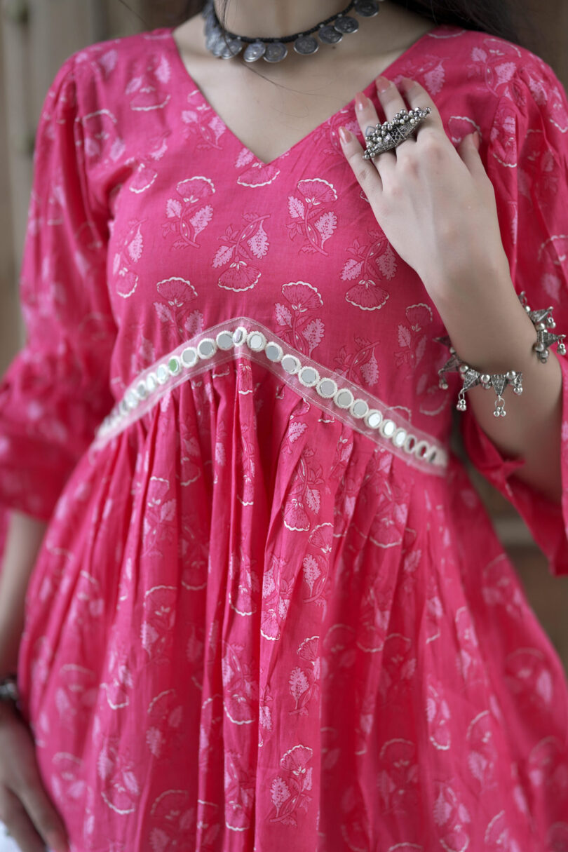 Radha is Designed in a vibrant rani pink shade. This kurti features a flared cut with a mirror lace under the bust for a flattering fit.