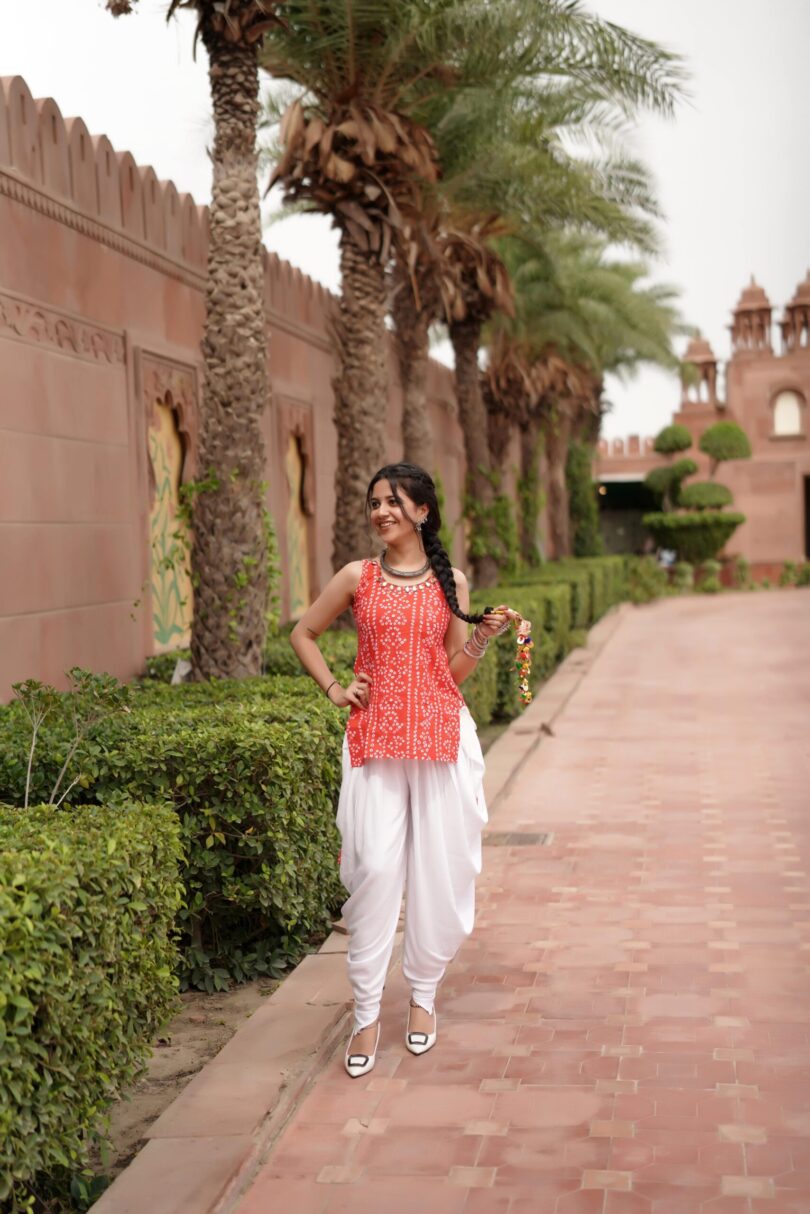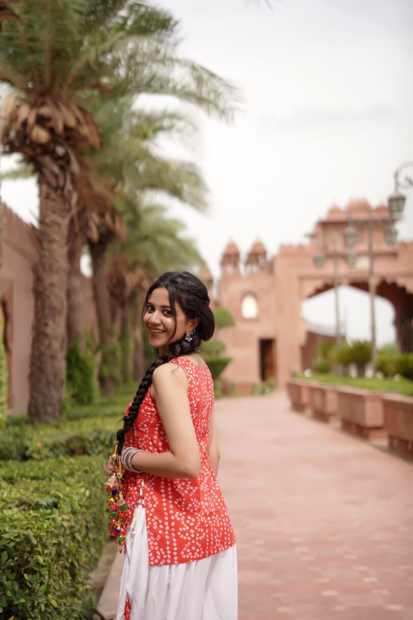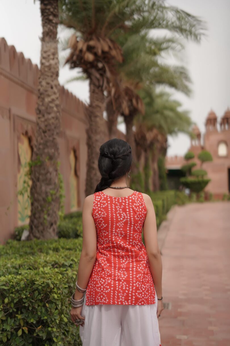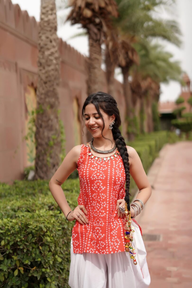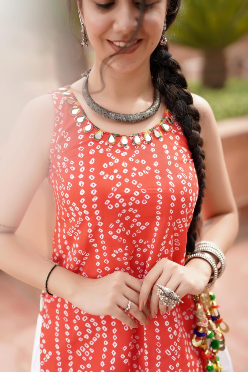 Rani-Sa crafted in a rich Rajasthani Bandhej print on a fiery red base, adorned with mirror lace on the neckline. The unique side lace-up dori design finished with playful tassels enhances the fit & flair.