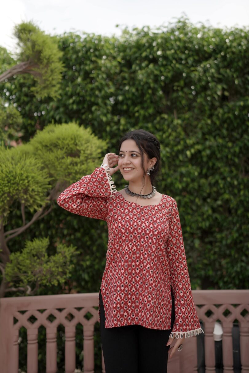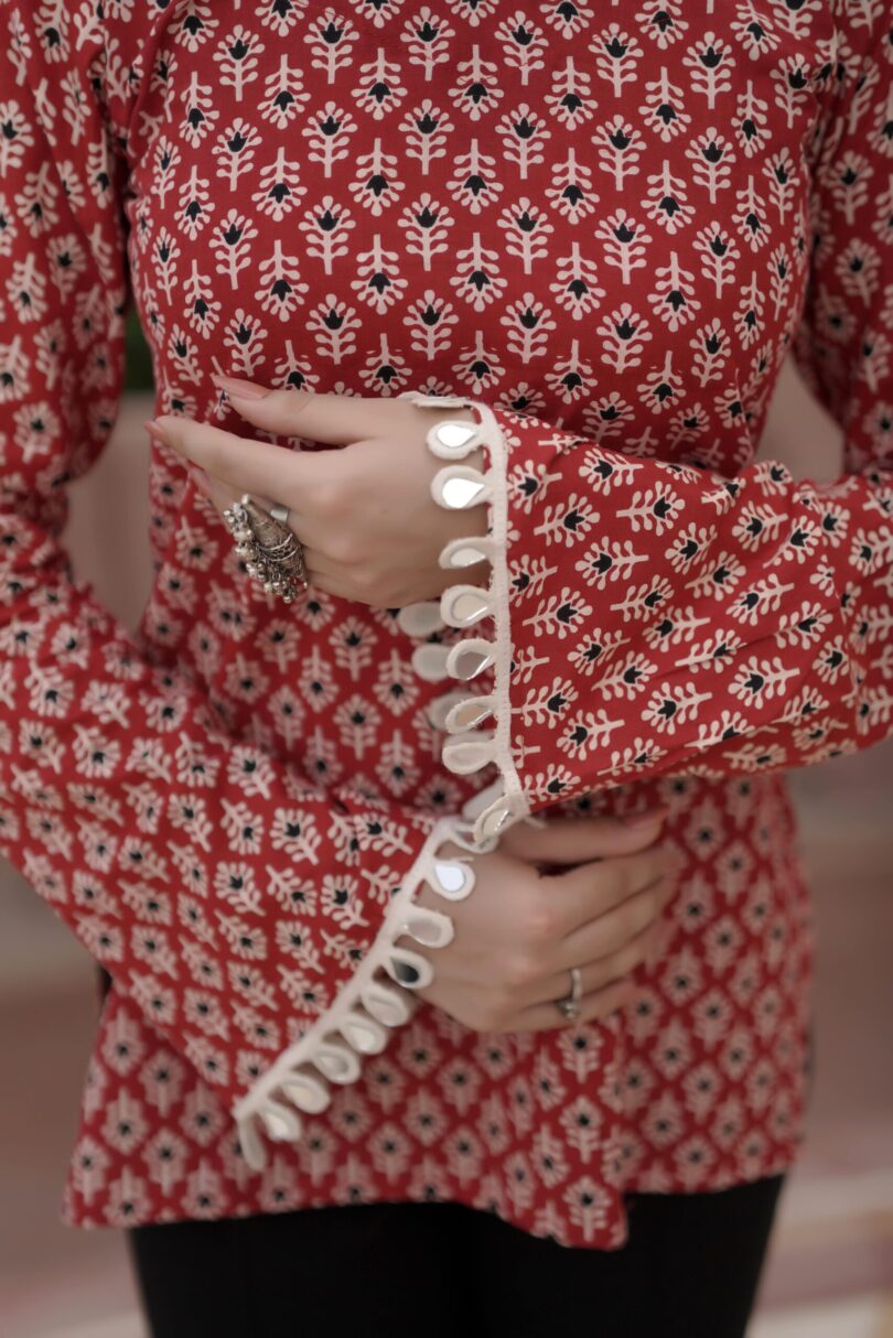 Sati is a beautiful blend of heritage & modern chic. It is designed with flared sleeves edged with teardrop mirror lace.