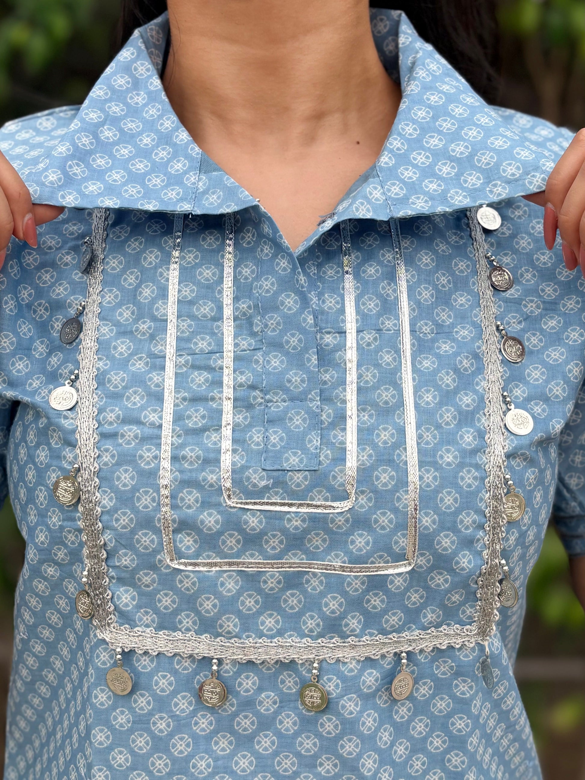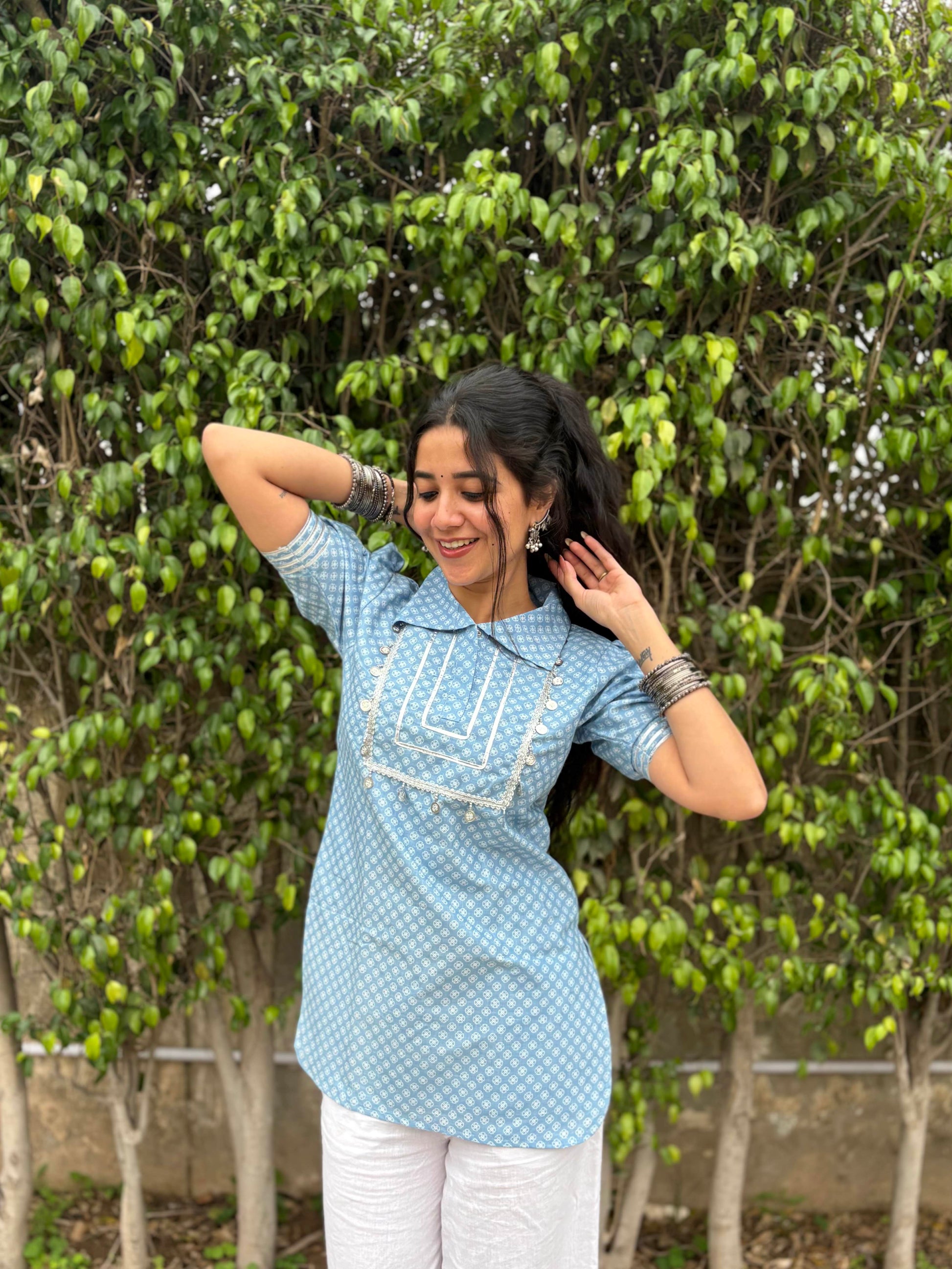 Hemlata- Powder Blue collar puffed sleeves kurti