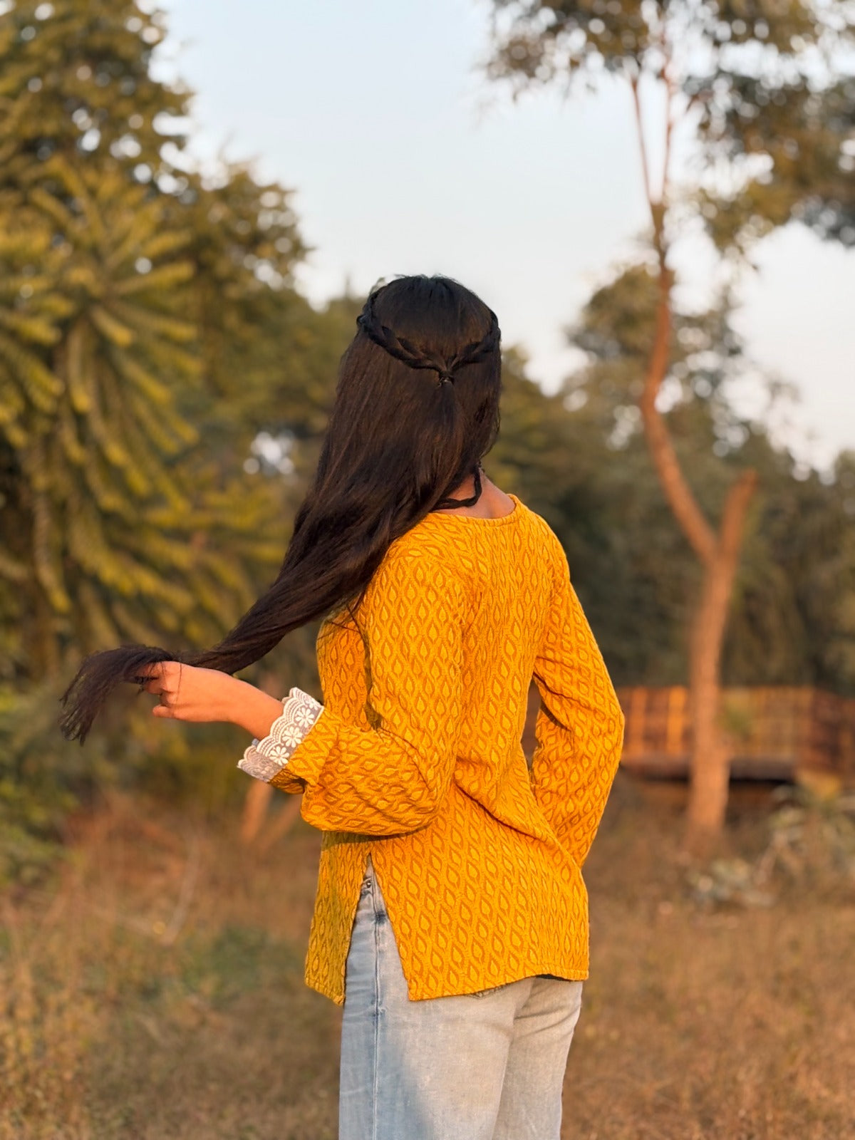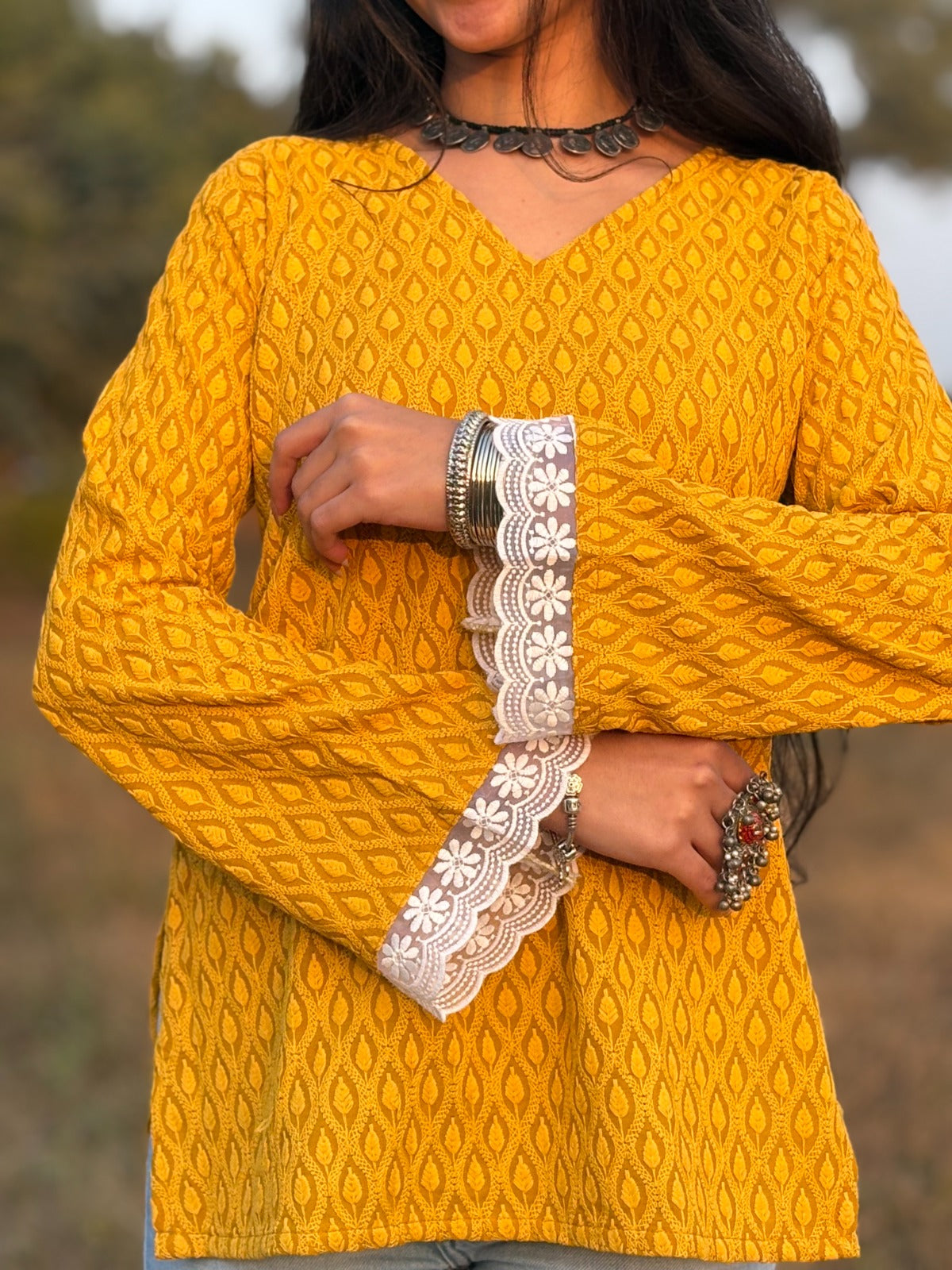 This V-neck straight-fit kurti features long flared sleeves finished with delicate white lace trim, adding a soft, feminine detail to a bold color.