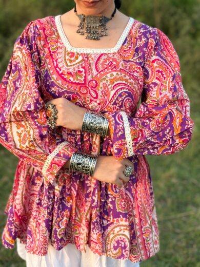 Amber ~ A timeless fusion of comfort & effortless grace. This floral kurti features a gathered empire waistline that falls