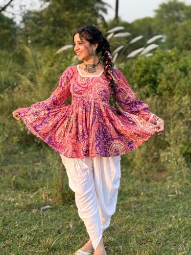 Elevate your ethnic wardrobe with our Bhavaani Purple Dhoti Set, a playful yet elegant fusion of tradition and modern style.