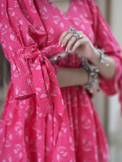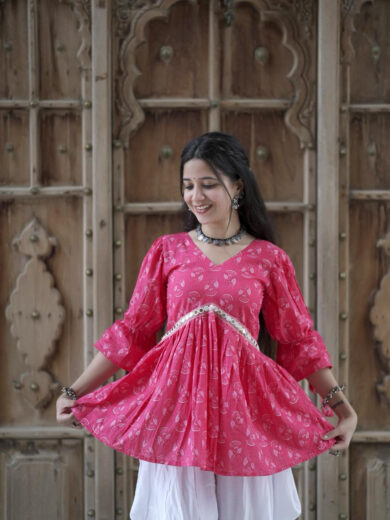 Radha is Designed in a vibrant rani pink shade. This kurti features a flared cut with a mirror lace under