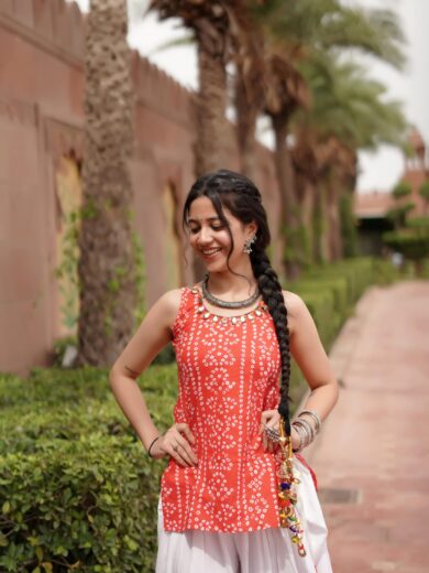 Product Description: Rani-Sa crafted in a rich Rajasthani Bandhej print on a fiery red base, adorned with mirror lace on