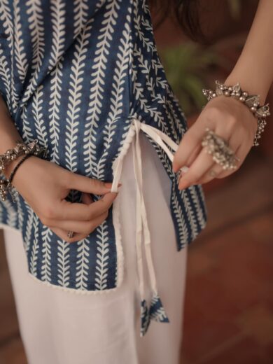 Step into elegance & comfort with our Neel sleeveless kurti. Made from breathable pure cotton. With tie up on shoulders