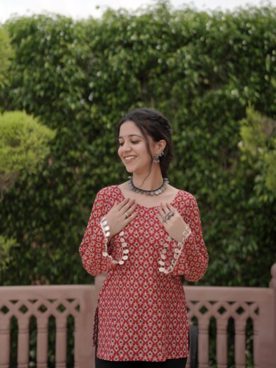 Sati is a beautiful blend of heritage & modern chic. It is designed with flared sleeves edged with teardrop mirror